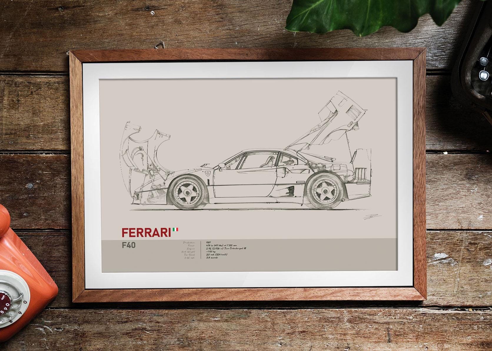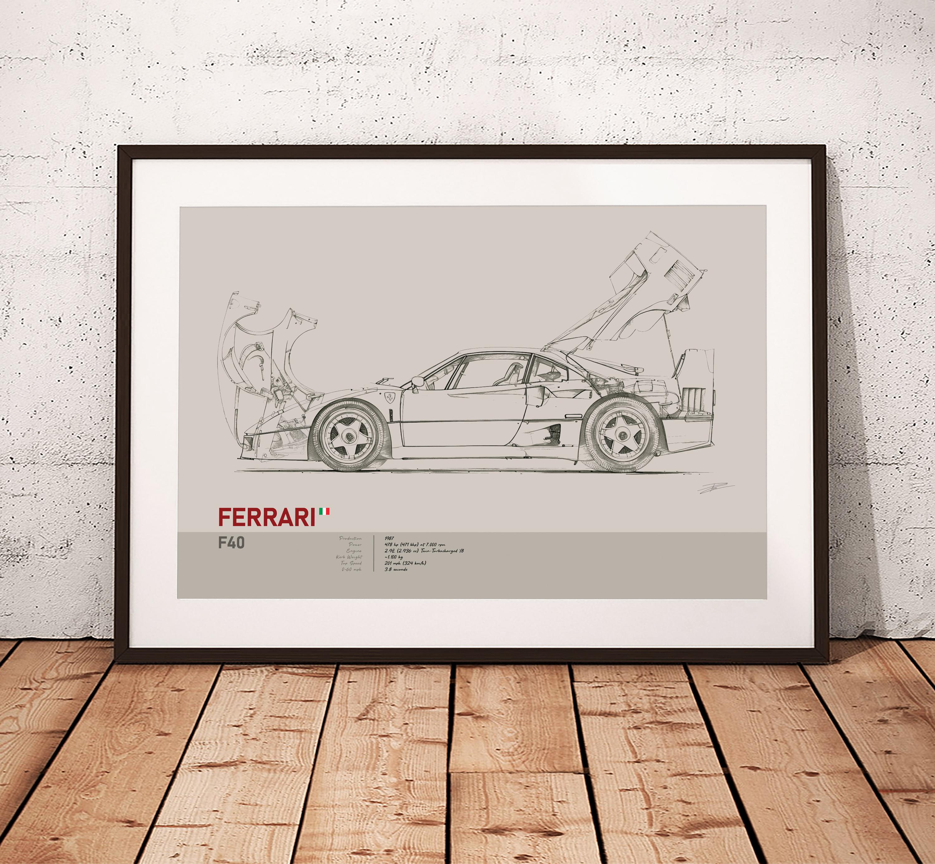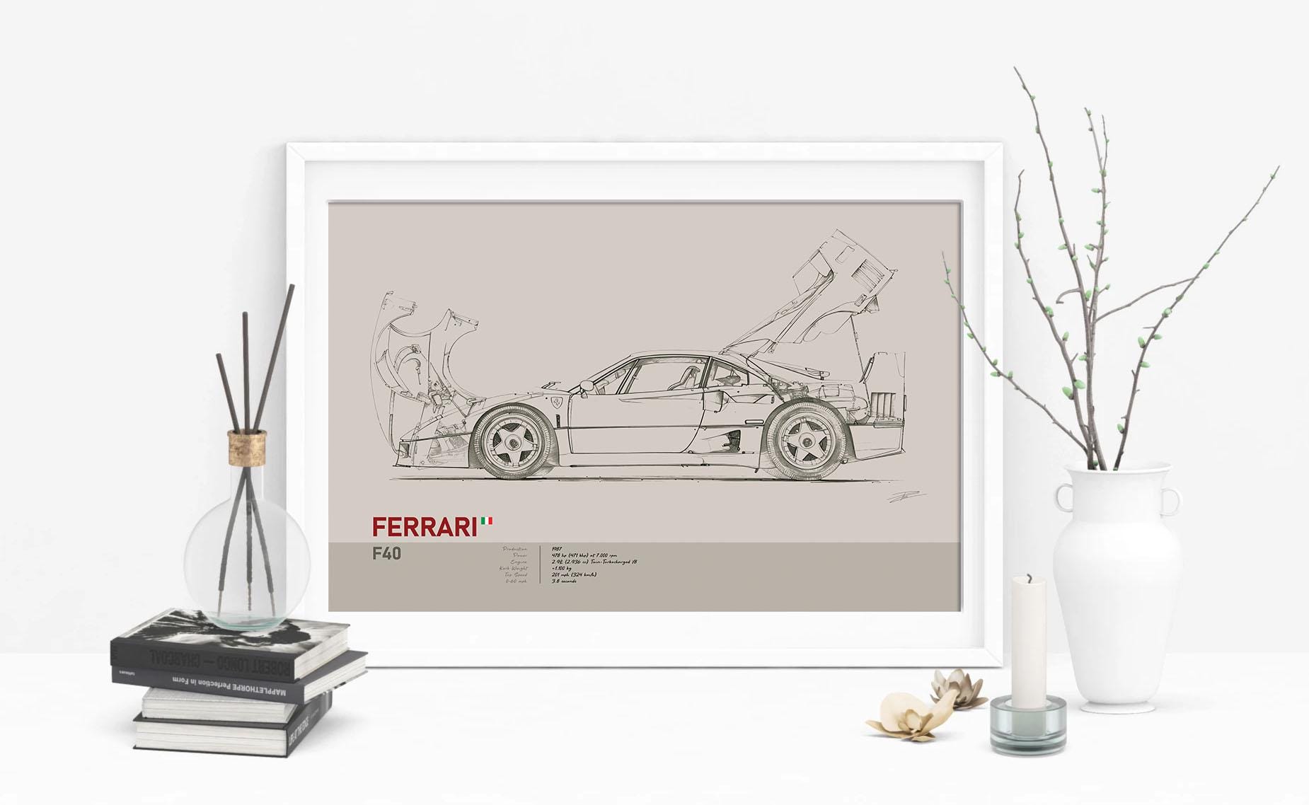 Celebrate the legendary Italian masterpiece that is the Ferrari F40 with this illustrated drawing of the automotive icon. Celebrate the F40's design heritage with this high-quality artwork poster print – a must-have piece for any true Ferrari lover, enthusiast, owner.