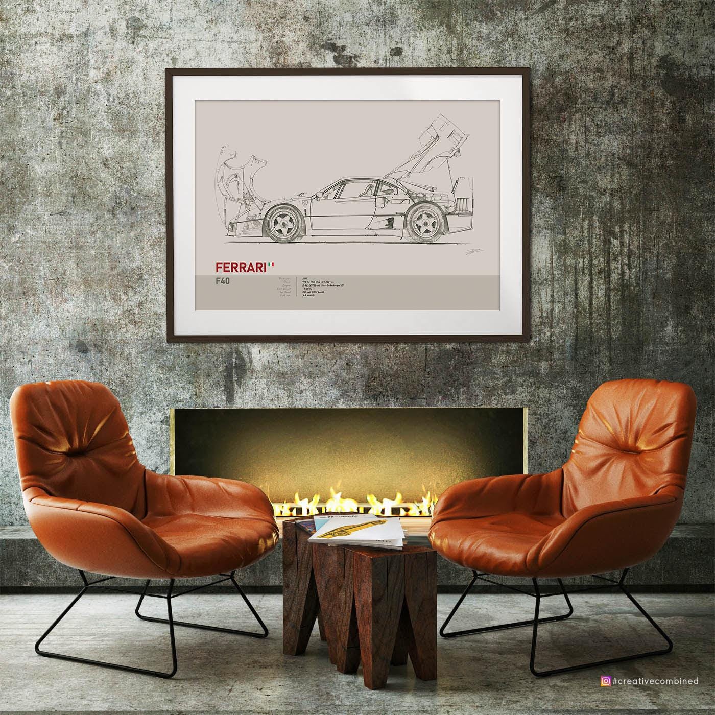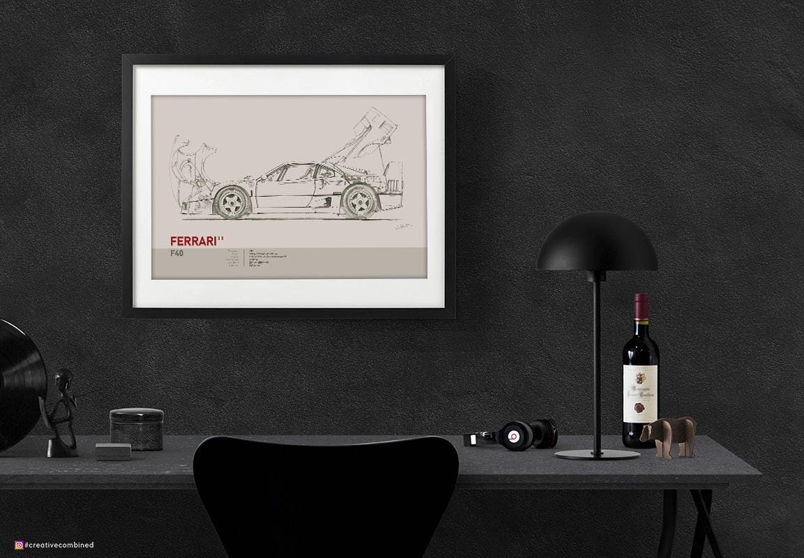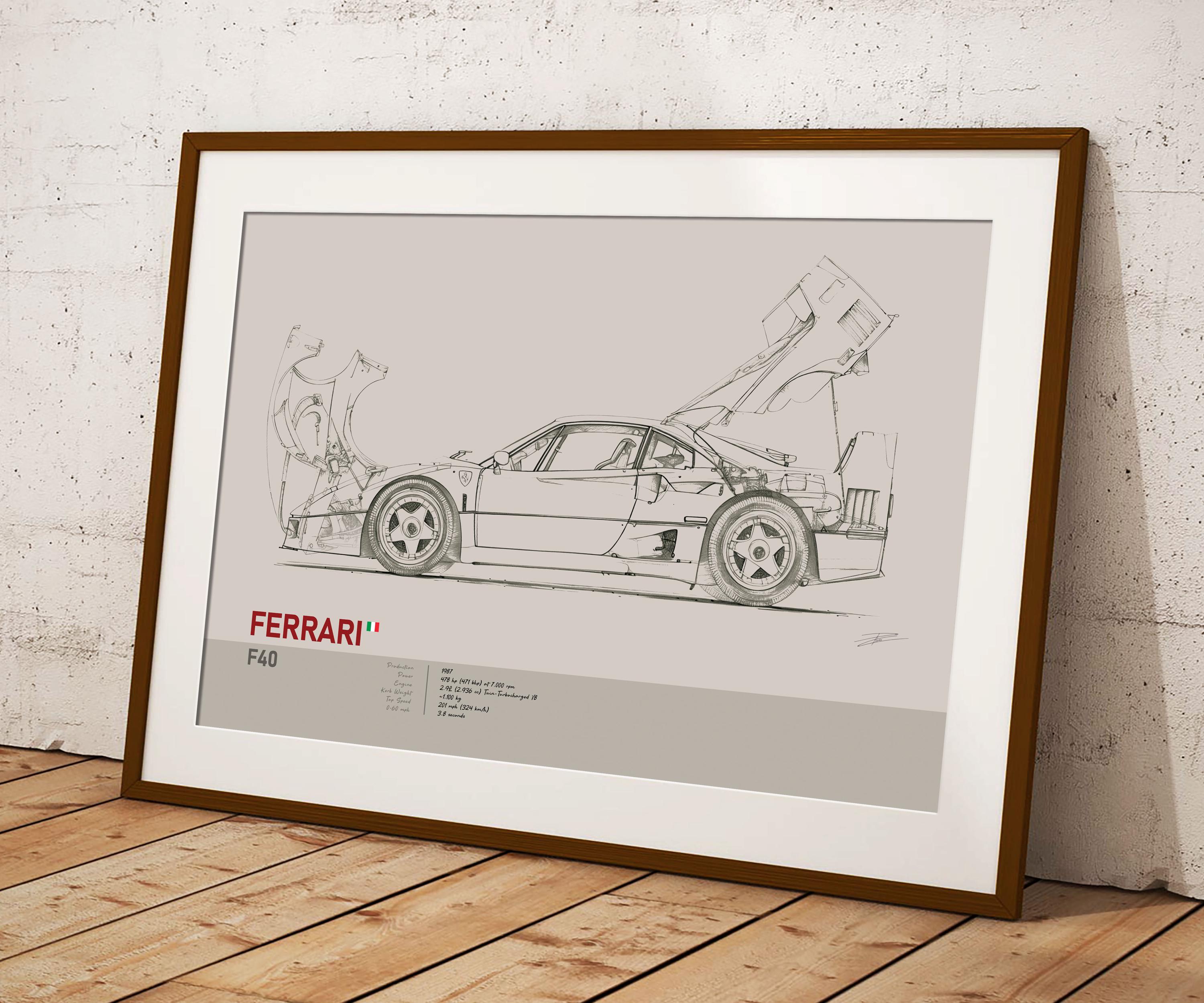 Celebrate the legendary Italian masterpiece that is the Ferrari F40 with this illustrated drawing of the automotive icon. Celebrate the F40's design heritage with this high-quality artwork poster print – a must-have piece for any true Ferrari lover, enthusiast, owner.