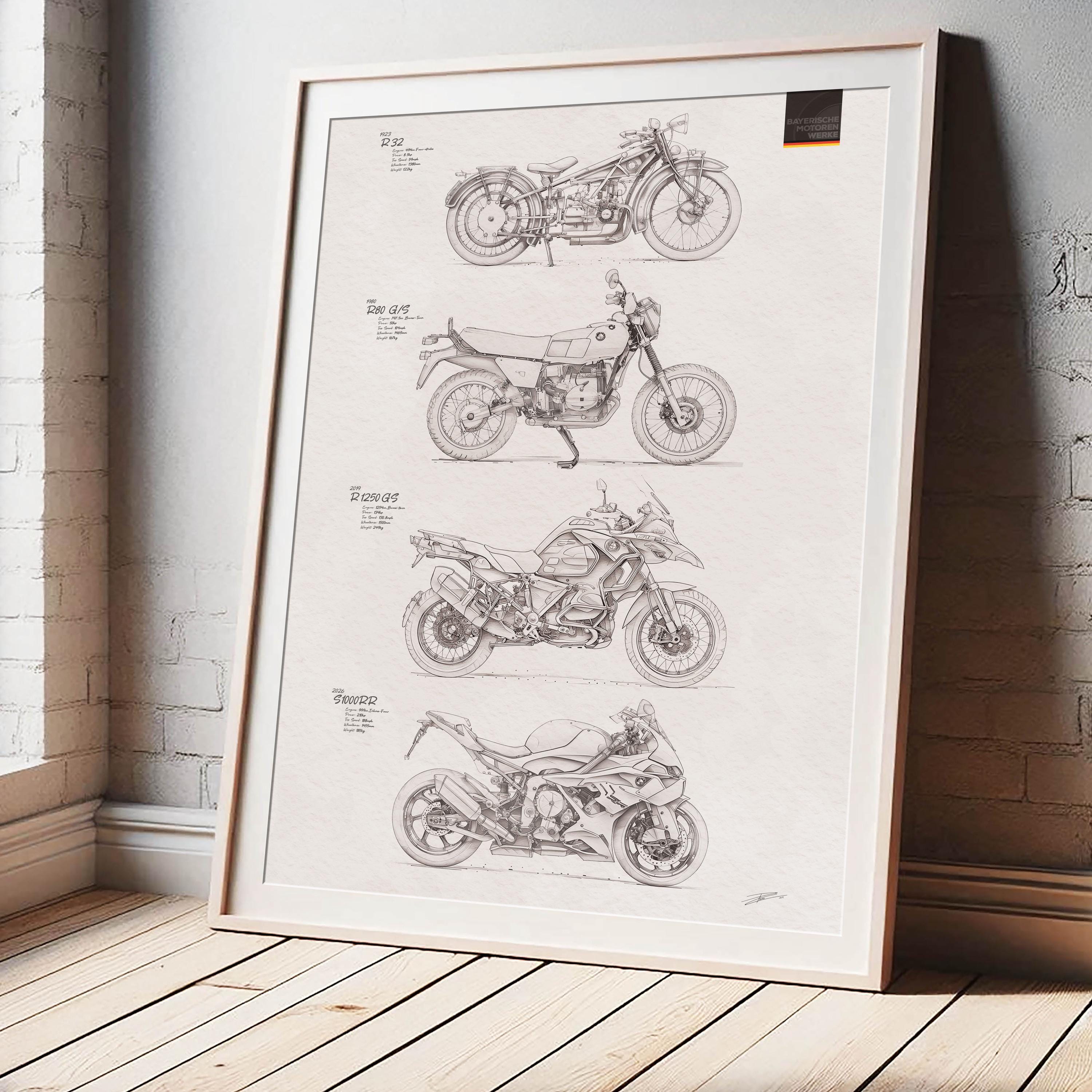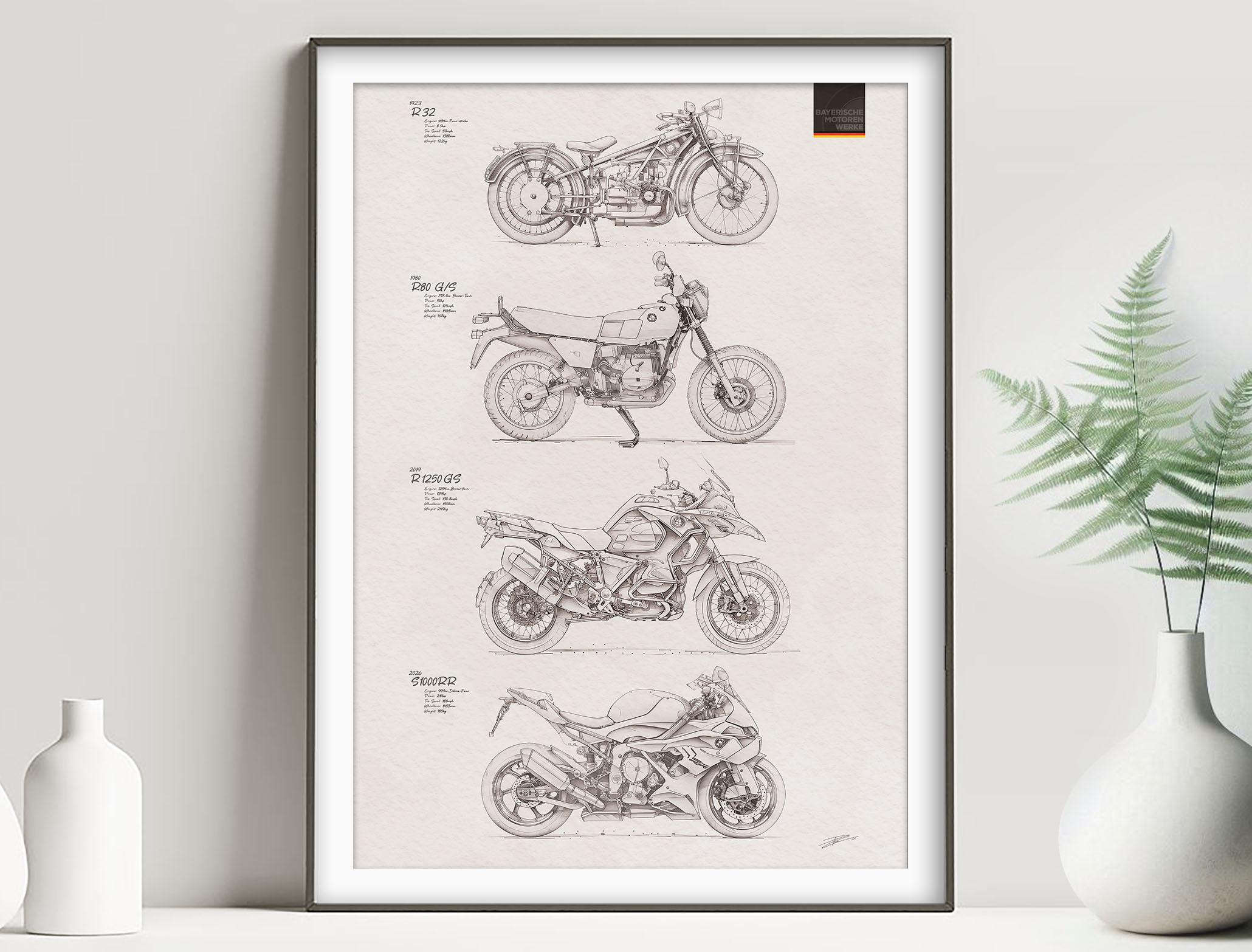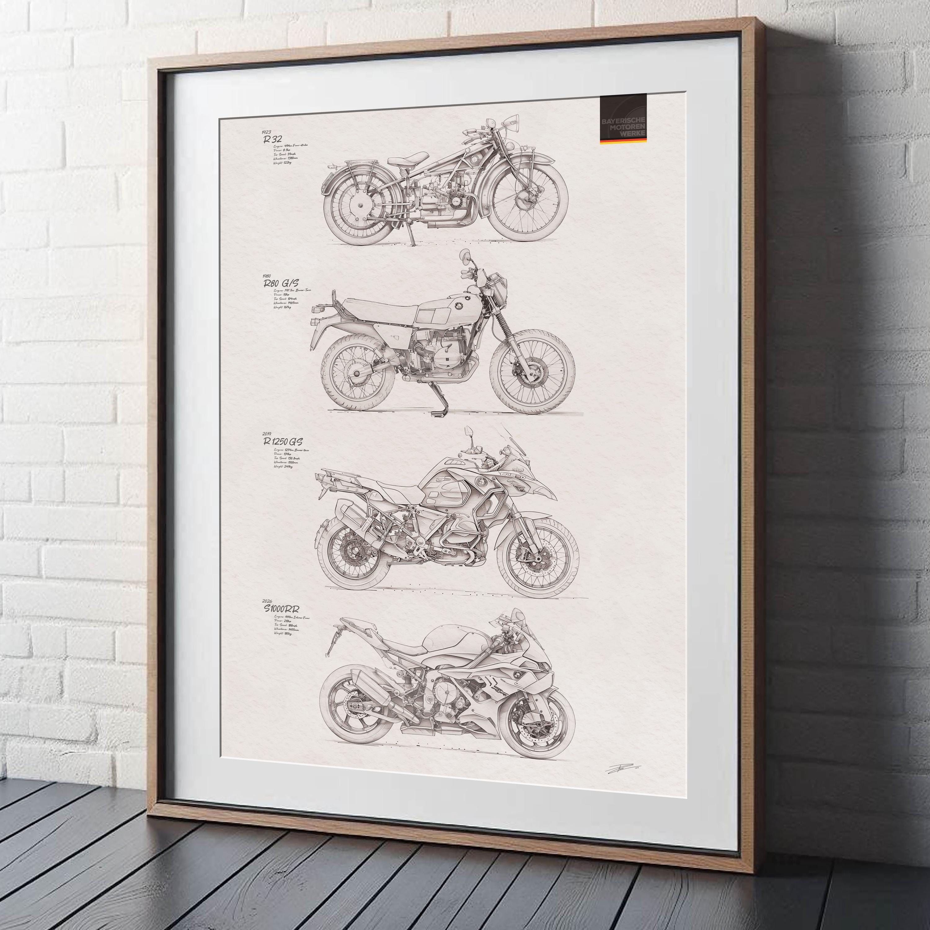 Celebrate the development of BMW Motorrad design over the years with this high-quality artwork poster print – a must-have piece for any true BMW or Motorcycle lover, motorsport enthusiast, or motorbike owner.
